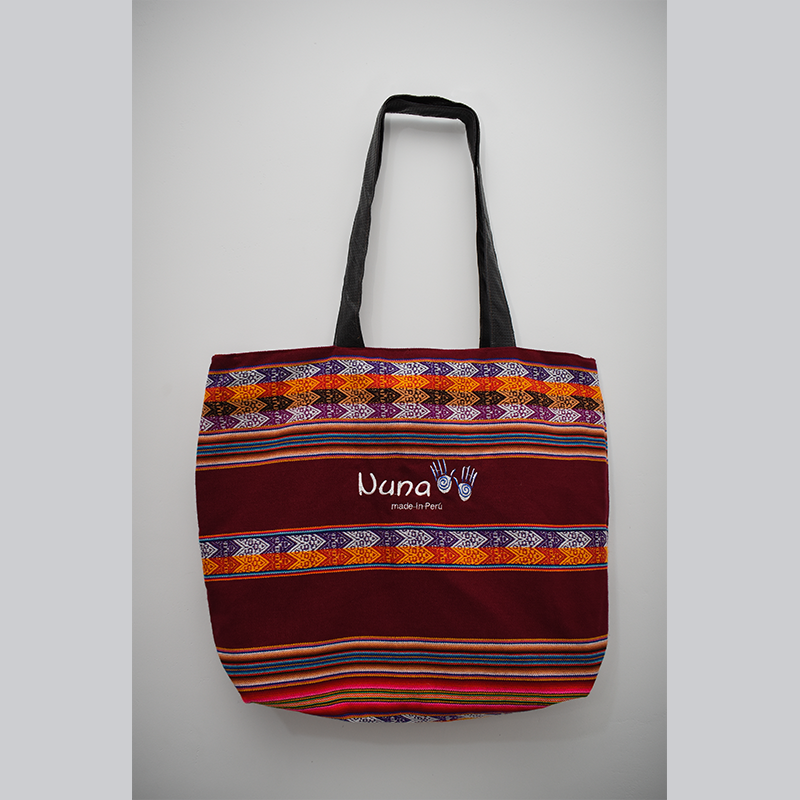 Stofftaschen mit peruanischen Motiven. Sie können auf der Schulter getragen werden und sind ein elegantes und praktisches Mittel zum Tragen und Aufbewahren von Tempelkleidung.