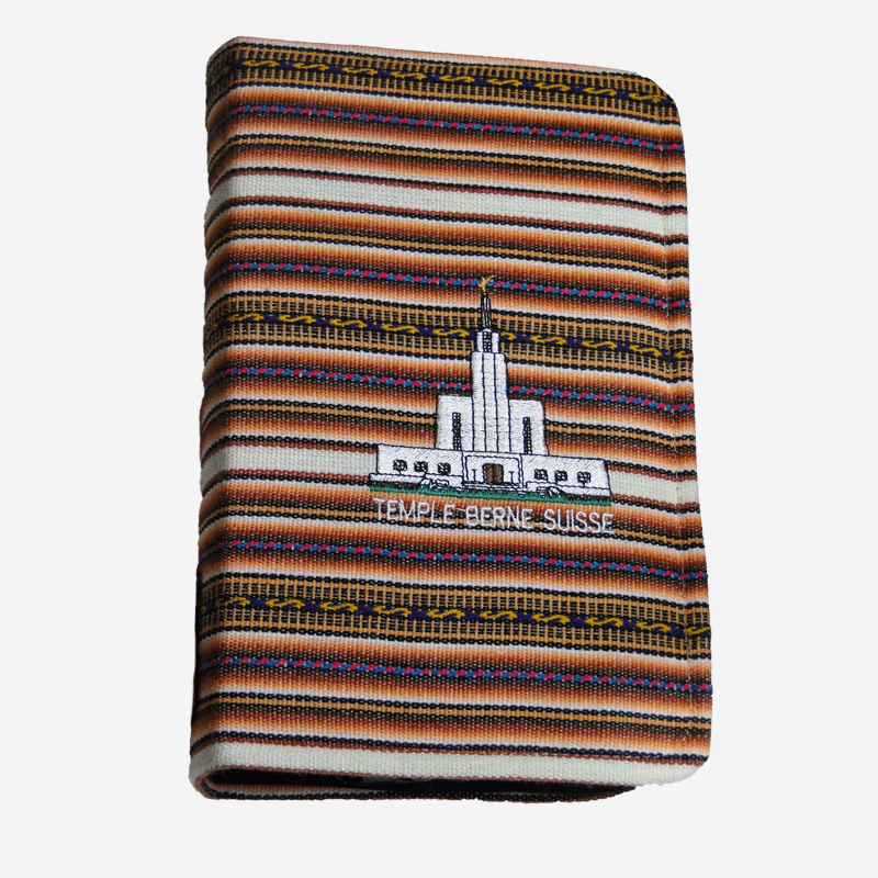Abdeckung zum Schutz der dreifachen Kombination der Schriftstellen, die an allen drei Seiten mit einem Reißverschluss versehen ist. Dieser Bezug besteht aus mehrfarbigem peruanischem Stoff mit rekonstituiertem Leder. Das Futter ist starr und leicht gepolstert.