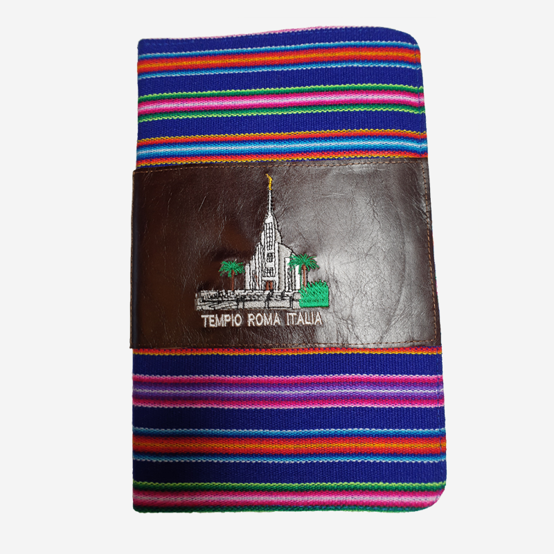 Cover to protect the triple combination of the Scriptures, zippered on three sides. This cover is in multicolored Peruvian fabric with reconstituted leather. Its lining is rigid and slightly padded.
